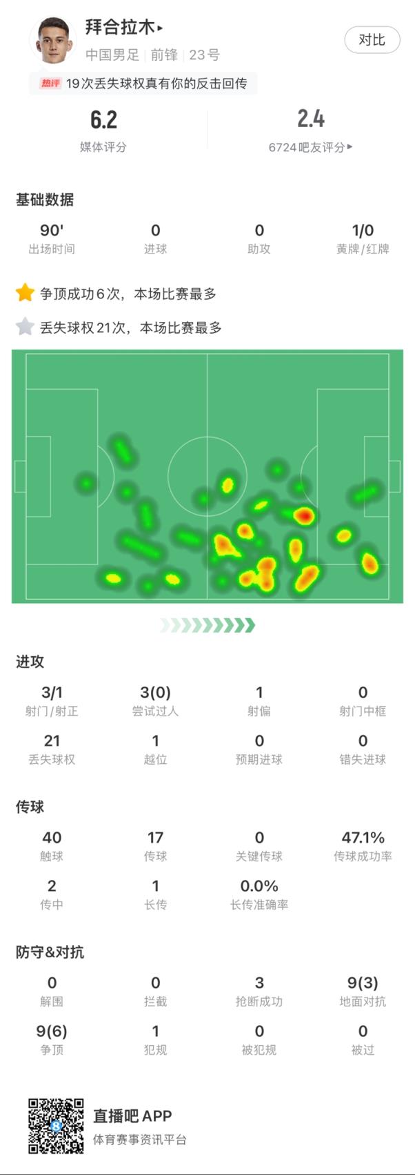09月11日讯 18强赛第2轮,国足主场1-2遭沙特逆转绝杀。本场比赛,拜合拉木打满全场,40次触球,21次丢失球权,17次传球,传球成功率47.1%,评分6.2全队最低。