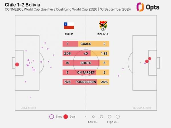 据Opta统计,智利此役控球率高达74%,射门次数19比5、射正5比2,但仍落败于玻利维亚,而玻利维亚时隔31年再次在南美世预赛的客场比赛中取胜。